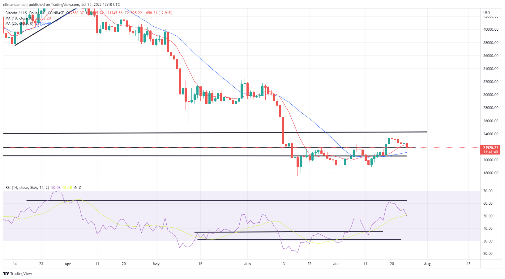 Yesterday saw BTC/USD trade at a high of $22,974.00, however as market turbulence heightened, prices of the token have slipped as a result.