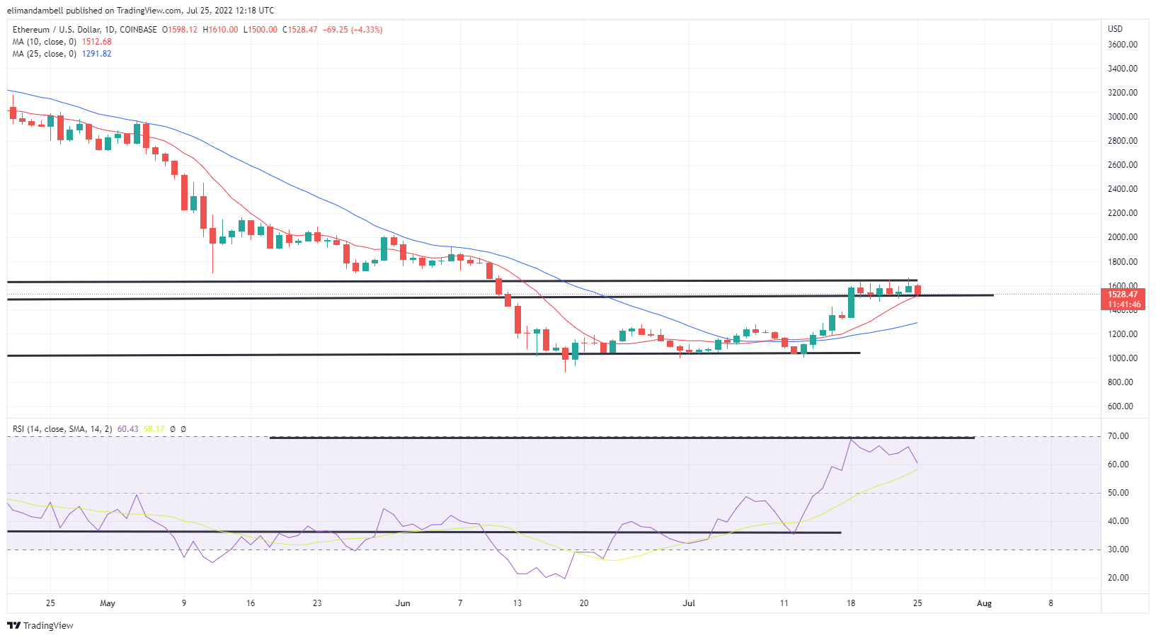 This week-long consolidation has been taking place between a floor of $1,500, and a recent price ceiling of $1,650.
